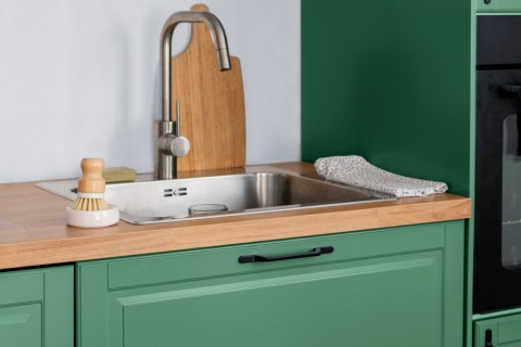 Junto a ellos, los verdes se están consolidando como uno de los grandes favoritos. Verde salvia, oliva o incluso verdes más profundos están apareciendo cada vez más en las puertas de cocina, islas y muebles altos.